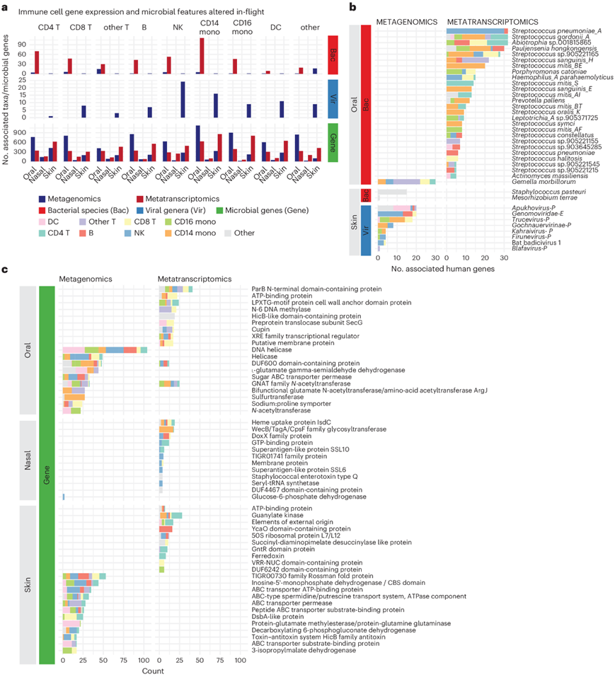 (a) 与不同免疫细胞亚型基因表达相关的微生物特征总数,按类型划分,其中基因表达在飞行后长期增加(左)或减少(右)。 (b) 与太空飞行相关的(丰度或表达增加)细菌和病毒,与最多数量的宿主基因相关。(c) 与最多数量宿主基因相关的太空飞行相关微生物基因。