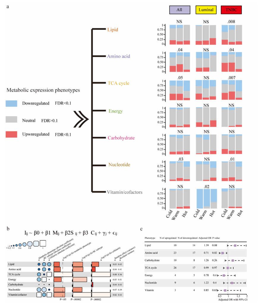 (a) 百分比堆叠柱状图显示了不同免疫状态下7种通路中基于代谢表型的基因表达分布。(b) Funkyheatmap描绘系数,随机项,残差方差和p值。(c) 森林图描绘了大量代谢表型和pCR之间的关联。