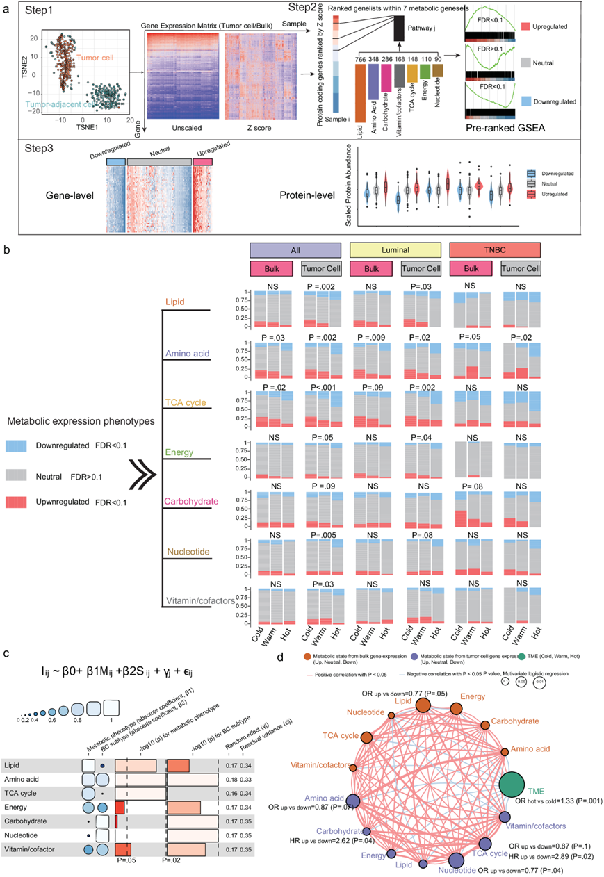(a) 将每个样本分为七种代谢通路中的三种基于 GEP 的代谢状态(上调、中性和下调)之一。(b) 三种免疫亚型/状态的七种代谢通路中代谢状态的百分比。(c) 热图描绘了 LMEM 的系数、随机项、残差方差和p值。(d)代谢表型与免疫状态的相互作用。