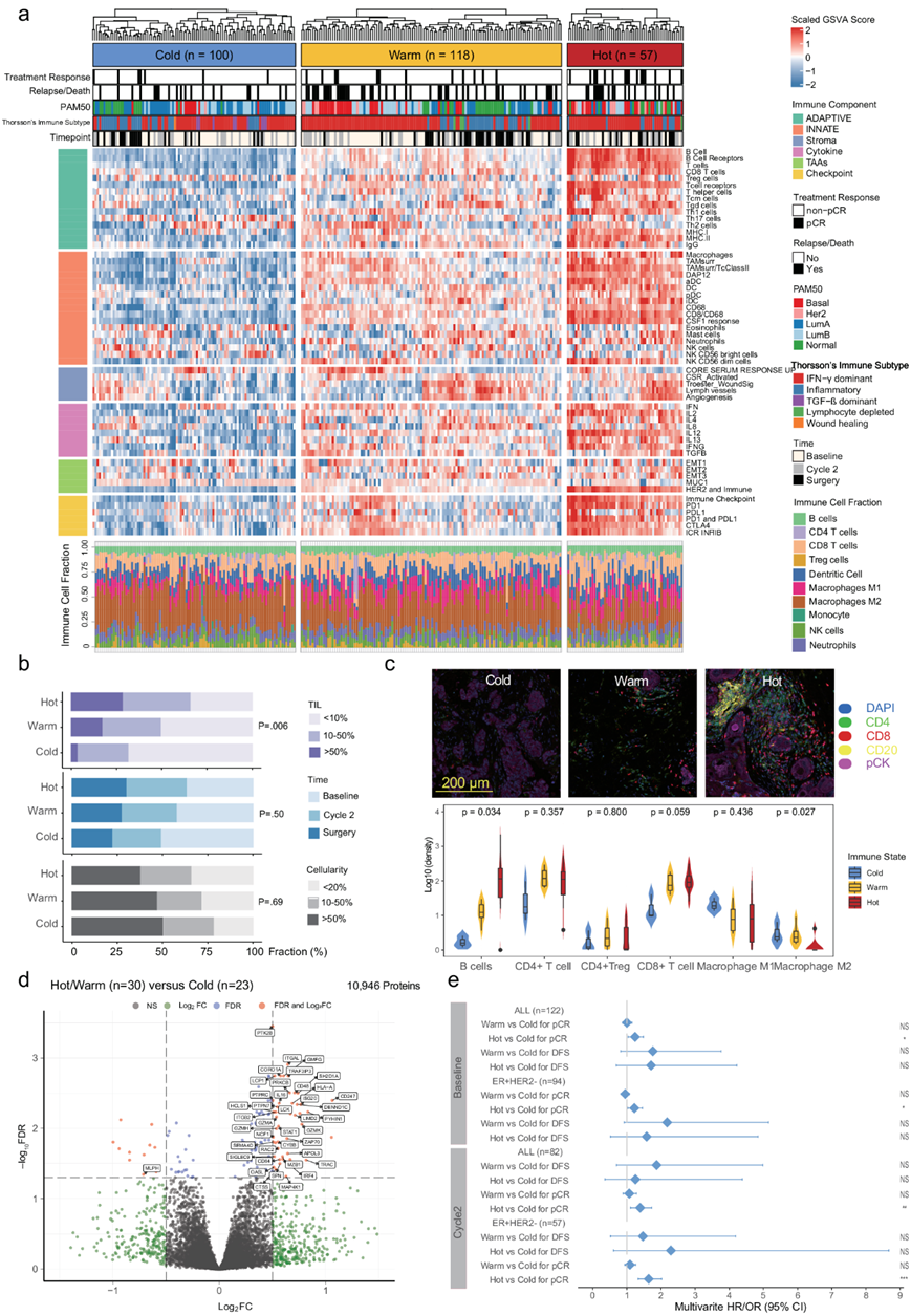 为了更好地描述 NAC 期间 TME 的演变,他们分析了三个时间点(NAC 前/中/后)的 GEP 数据,并使用 mf IHC 和基于 MS 的蛋白质组学在蛋白质水平以及外部队列进行验证。使用 GEP,通过将代表七种免疫成分的综合免疫特征与基于 quanTIseq分析的免疫细胞部分相结合来建模无监督的免疫状态聚类,将所有样本分为三种不同的免疫状态:冷(n = 100)、温(n = 118)和热(n = 57)(图 2a)。总体而言,免疫评分最高的热肿瘤也具有上调的整体免疫相关特征评分,冷肿瘤则反之亦然(图 2a),而 KI67 mRNA 在三组之间是可比的。总体而言,三阴性乳腺癌 (TNBC)(基于 IHC)/基底样(PAM50 内在亚型)肿瘤标记为热(均为 38.6%),而管腔 A/B 肿瘤在免疫学上为冷(71%)。有趣的是,当用 Thorsson 的 PanCancer 免疫亚型31注释样本时,>80% 的热肿瘤归类为 IFN-γ 显性,而发挥全身免疫抑制并抑制宿主免疫监视的 TGF-β 显性亚型仅出现在冷肿瘤中(图 2a)。热肿瘤中的中等(10-50%)和高密度(>50%)TIL 浸润(65.6%)比温肿瘤(49.4%)或冷肿瘤(31.3%)更高。 三种免疫状态下的时间点和肿瘤细胞数分布均无差异(图2b)。