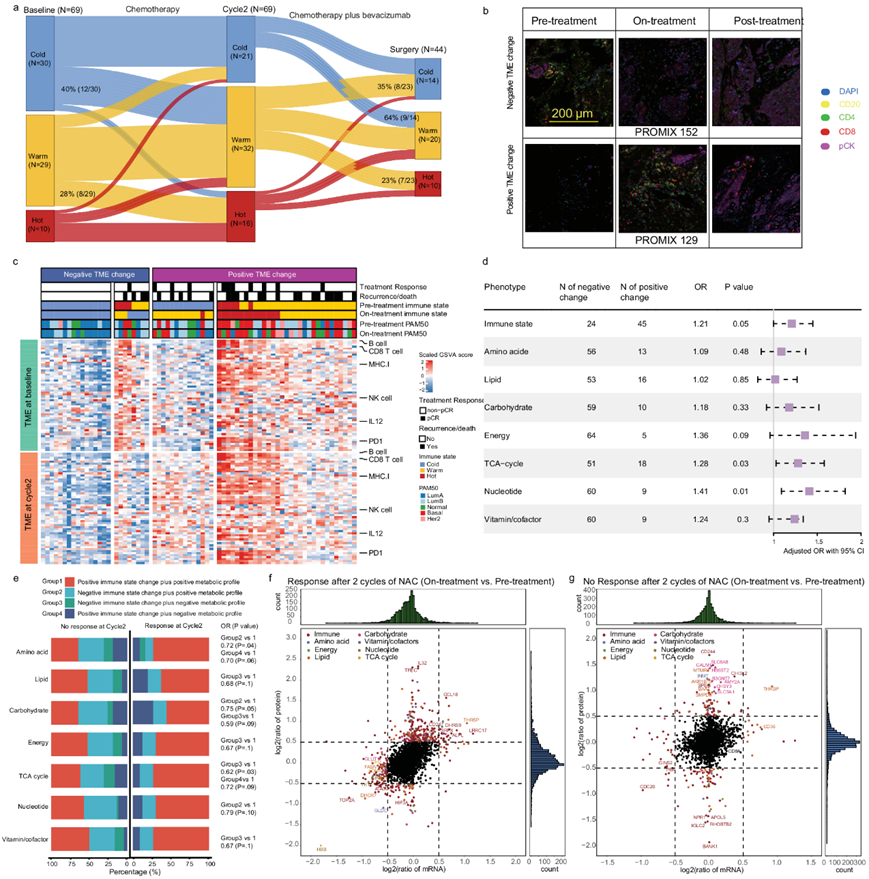 (a) 从治疗前(基线)到治疗中(周期 2)以及从治疗中到治疗后(手术)的免疫状态变化的桑基图。(b) 别来自 16 个独立实验的代表性mfIHC图像。(c) 69 对治疗前/治疗中样本的免疫特征。(d) 森林图描绘了多变量逻辑回归模型。(e) 条形图显示在两轮 NAC 治疗后,反应组和无反应组(部分反应与疾病稳定或疾病进展)中综合免疫状态与基于肿瘤细胞 GEP 的代谢状态变化的分布。(f-g) 散点图分别显示反应组和无反应组(部分反应与疾病稳定或疾病进展)中治疗中和治疗前样本之间的成对差异蛋白质(y 轴)和 mRNA(x轴)表达。