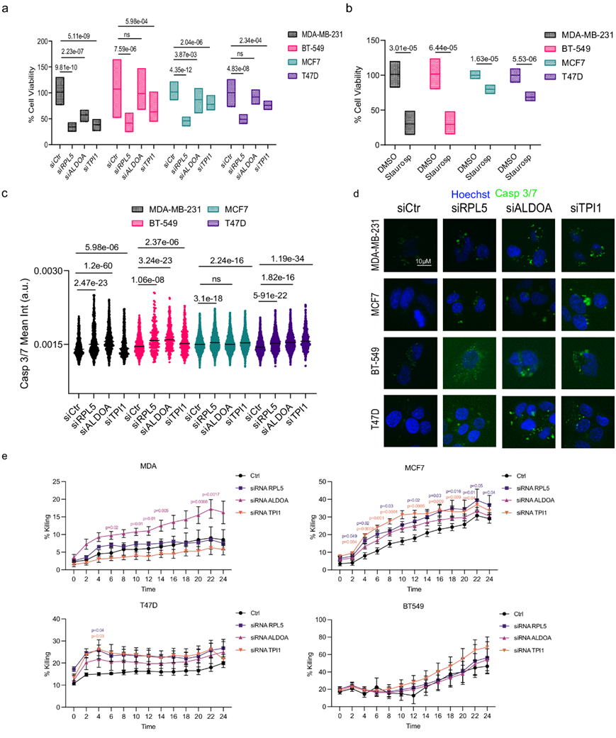 (a-b) 对两种腔内(MCF7、T47D)和两种基底样(MDA-MB-231、BT-549)乳腺癌细胞系进行 XTT检测。 (c)细胞凋亡分析。(d) 用于(c)中所示分析的代表性免疫荧光图像。 (e) 肿瘤细胞杀伤百分比。