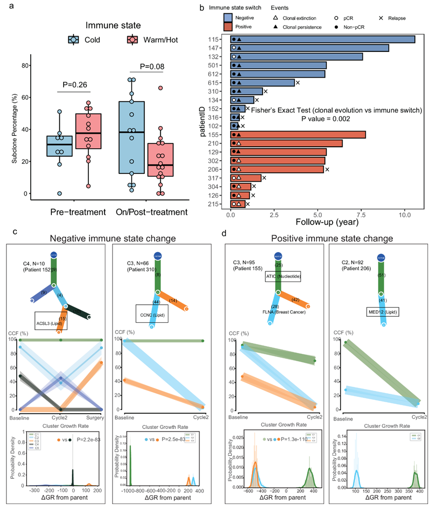 为了深入了解肿瘤细胞和免疫状态在 TME 下如何共同进化,他们对 PROMIX 试验中 20 名 TNBC 患者的纵向肿瘤样本的 WES 数据进行了克隆性分析。他们观察到基线热/温肿瘤比具有冷免疫表型的肿瘤更具异质性(图 9a)。肿瘤块包含不同适应度的克隆,并且异质克隆在没有选择压力的情况下共存。他们在治疗中/治疗后的热/温肿瘤中鉴定出的亚克隆数量低于冷肿瘤(图 9a)。治疗后冷肿瘤还获得了更多的癌症特异性突变(即BRCA2、TPR、OMD、RANBP2、EP300)。如果基线时存在的90%以上的突变在NAC后消失或治疗后样本中存在10个以下突变,则将该状态定义为克隆消亡,所有其他情况定义为克隆持续存在。他们发现免疫状态变化与治疗期间的克隆进化相关(图 9b)。具有正向免疫状态变化的肿瘤更多地与克隆消亡相关(7/9),而负向免疫状态变化与克隆持续相关(11/11)。