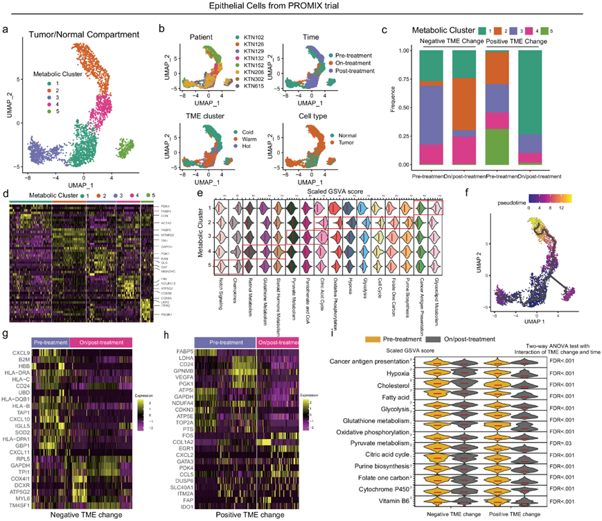 (a) 在 PROMIX 试验中识别出乳腺癌治疗前/治疗中/治疗后乳腺上皮细胞的五个代谢聚类(MC1-5)。(b) 特征图显示样本 ID、采样时间点、TME 亚型和每个代谢乳腺上皮细胞亚聚类中的细胞类型。 (c) 每个采样时间点代谢上皮细胞聚类按免疫状态变化的百分比。(d) 与( a )中所有其他聚类相比,前 10 个差异表达基因的热图。(e) 根据代谢特征评分分析和量化每个乳腺上皮细胞聚类 (MC) 的代谢特征。(f) 乳腺上皮细胞代谢聚类的 UMAP可视化。(g-h) 治疗前后乳腺上皮细胞差异表达基因表达水平的热图。(i) 治疗前后乳腺上皮细胞的代谢基因特征分数的堆叠小提琴图。