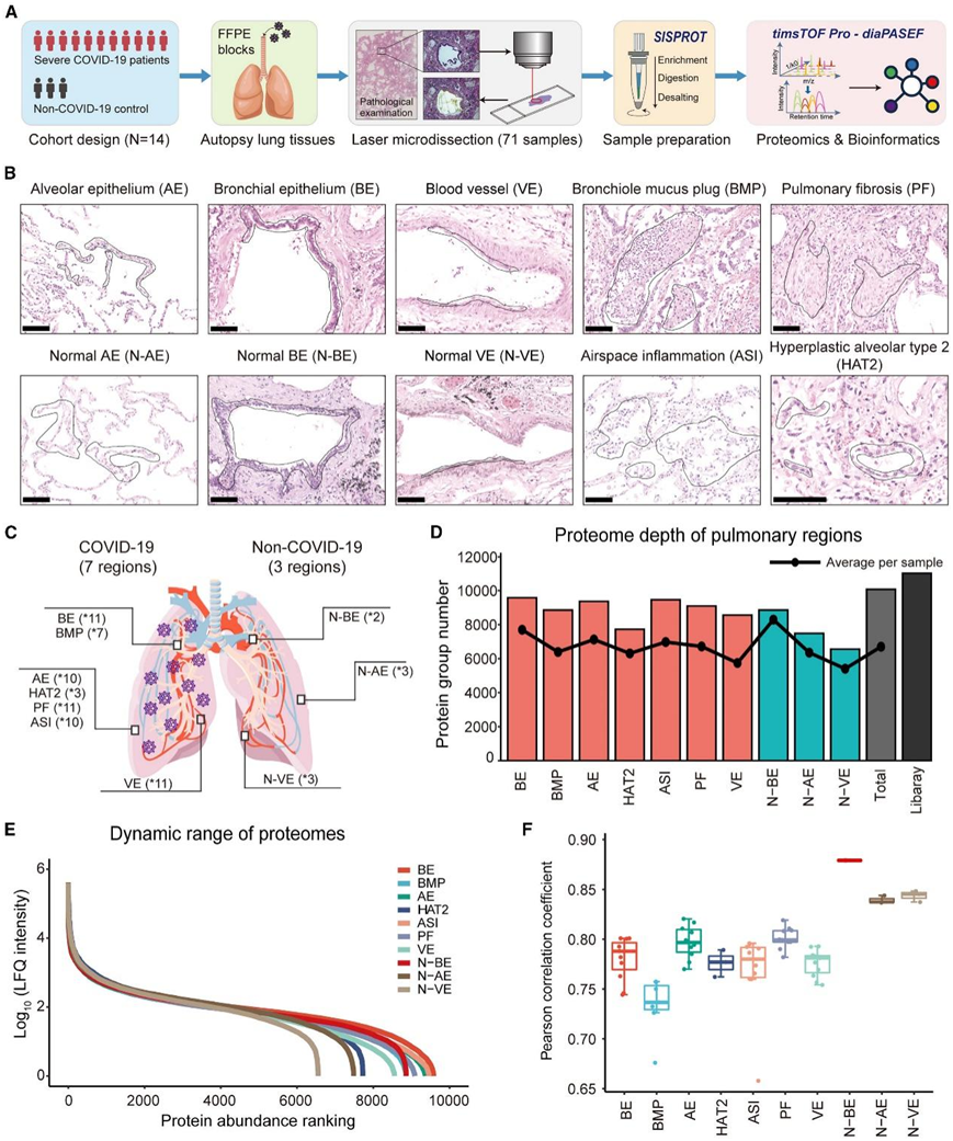 本项研究进行了全面的严重 COVID-19 相关肺损伤的蛋白质组分析,该研究团队开发了一个特定于项目的工作流程以提高灵敏度(图 1 A)。他们还收集了其他三名交通事故或冠心病受害者的健康肺部的福尔马林固定石蜡包埋 (FFPE) 标本。经过彻底的肺部组织病理学分析后,他们选择并解剖了十个感兴趣区域 (ROI)(图 1B-C)。其中包括来自 COVID-19 样本的三种基本肺部结构,即肺泡上皮 (AE)、支气管上皮 (BE) 和血管 (VE),以及配对的形态正常的非 COVID-19 样本,即非AE(N-AE)、非BE(N-BE)和非(N-VE)。 此外,他们还收集了四种关键的病理改变,即 细支气管粘液栓 (BMP)、肺纤维化 (PF)、空腔炎症 (ASI) 和增生性肺泡 2 型细胞 (HAT2),用于随后的空间蛋白质组分析。