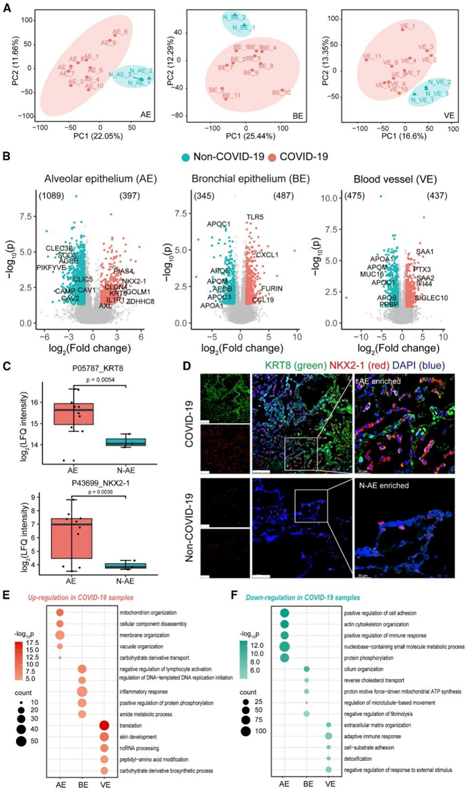 (A) 重症 COVID-19 患者和非 COVID-19 对照个体肺部三种基本结构的蛋白质组谱的 PCA。(B) 显示了三种基本肺部结构的 COVID-19 样本与非 COVID-19 样本的火山图。(C) COVID-19 肺部和非 COVID-19 肺部 AE 区域中 KRT8 和 NKX2-1 蛋白表达的箱线图。(D) 来自 COVID-19 肺部和非 COVID-19 肺部的 AE 区域中 KRT8 和 NKX2-1 的免疫荧光图像。(E-F) 点图显示了 COVID-19 肺部中 AE、BE 和 VE 区域显著上调的蛋白质富集的前 5 个 GOBP 和 KEGG通路。