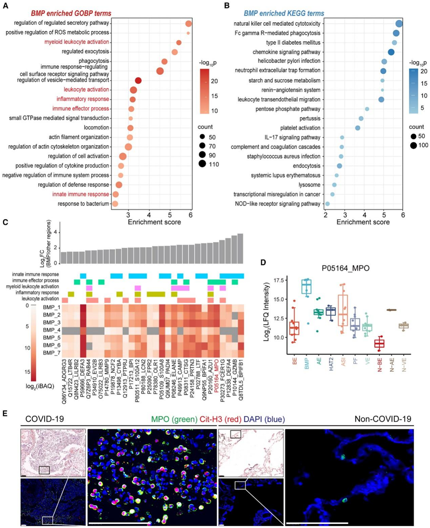 (A) 点图显示富含 BMP 的蛋白质聚类的前 20 个重要 GOBP通路。(B) 点图显示富含 BMP 的蛋白质聚类的前 20 个显著KEGG通路。(C) 所选 GOBP 通路的蛋白质表达模式。(D) COVID-19 和非 COVID-19 肺部 10 个区域中 MPO 蛋白表达的箱线图。(E) COVID-19 BMP 区域和非 COVID-19 细支气管区域中 MPO 和 Cit-H3 的免疫荧光图像。