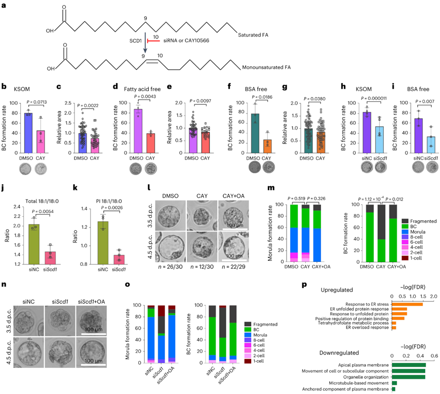 (a) 示意图显示 SCD1 介导 MUFA 合成,以及阻止该过程的方法。(b,d,f) 用二甲亚砜 (DMSO) 或 100 nM CAY10566 (CAY) 处理的胚胎在常规 KSOM 培养基、不含脂肪酸的 KSOM或不含 BSA 的 KSOM 中培养的胚泡形成率。(c,e,g) 用DMSO或CAY10566处理并在常规KSOM培养基、不含脂肪酸的KSOM培养基或不含BSA的KSOM培养基中培养后的囊胚腔面积。(h-i) 敲低Scd1并在常规 KSOM或不含 BSA 的 KSOM 培养基中培养后的囊胚形成率。 (j-k) 条形图显示敲除Scd1后总脂质和 PI的 C18:1/C18:0 比率。(l-n) 用抑制剂或 si Scd1处理的小鼠胚胎在 3.5 或 4.5 dpc 时的代表性图像。(m-o)堆积柱形图,显示用抑制或 si Scd 1处理后处于不同发育阶段的胚胎分数。(p)GO分析。
