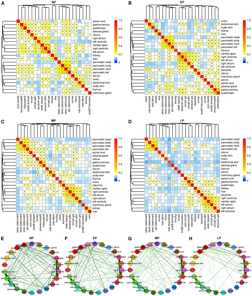 (A-D) 相关热图显示了NP、EP、MP 和LP 阶段组织之间的代谢耦合。(E-H) 相关网络显示了NP、EP、MP 和LP 阶段组织之间代谢耦合的非线性演化。