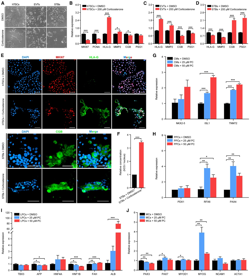 (A) 相差图像显示用 DMSO 和 200 μM 皮质酮处理后人滋养层干细胞 (hTSC)、绒毛外滋养层 (EVT) 和多核合体滋养层 (STB) 的形态。(B)用 DMSO 和 200 μM 皮质酮处理后,对 hTSC 中MKI67和PCNA、HLA-G和MMP2以及CGB和PSG1的mRNA 表达水平。(C)用 DMSO 和 200 μM 皮质酮处理后,对 EVT 中HLA-G和MMP2以及CGB和PSG1的 mRNA 表达水平进行实时定量 PCR 分析。(D)用 DMSO 和 200 μM 皮质酮处理后,对 STB 中HLA-G和MMP2以及CGB和PSG1的 mRNA 表达水平进行实时定量 PCR 分析。(E)用 DMSO 和 200 μM 皮质酮处理后,hTSC 中的 Ki67 和 HLA-G 以及 STB 中的 CGB 的免疫染色。(F)用 DMSO 和 200 μM 皮质酮处理后,用酶联免疫吸附测定 (ELISA) 测定每个细胞核产生和分泌的人绒毛膜促性腺激素 (hCG)糖蛋白的相对浓度。(G)用 DMSO、25 和 50 μM 棕榈酰肉碱 (PC) 处理后,对心肌细胞 (CM) 中NKX2-5、ISL1和TNNT2的 mRNA 表达水平进行定量实时 PCR 分析。(H)用DMSO、25和50μM棕榈酰肉碱(PC)处理后胰腺祖细胞(PPC)中PDX1、RFX6和PAX4的mRNA表达水平的实时定量PCR分析。(I)用 DMSO、25 和 50 μM 棕榈酰肉碱 (PC) 处理后,对肝祖细胞 (LPC) 中TBX3、AFP、HNF4A、HNF1B、FAH和ALB mRNA 表达水平。