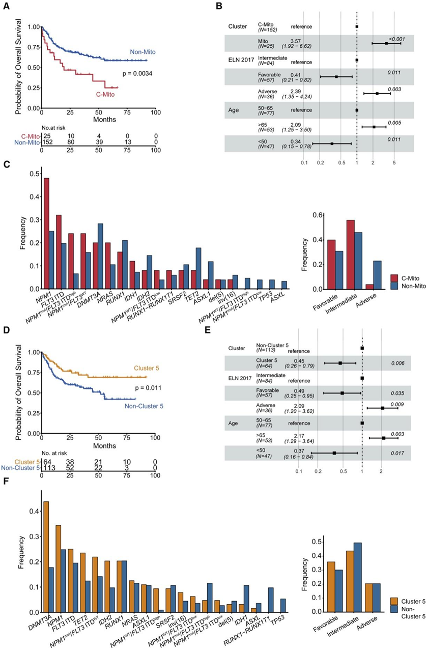 (A) C-Mito 和非 Mito 患者总体生存的 Kaplan-Meier 模型。 (B) 基于多变量 Cox 回归分析的 HR 的森林图,了解发现队列中患者的总体生存率。(C)(左图)C-Mito 组和非 Mito 组中细胞遗传学和分子遗传学特征的分组频率。(右图)C-Mito 组和非 Mito 组中 ELN 细胞遗传学风险类别的分组频率。(D) C5 和非 C5 患者总体生存的 Kaplan-Meier 模型。(E) 基于多变量 Cox 回归分析的 HR 的森林图,了解发现队列中患者的总体生存率。(F)(左)C5 和非 C5 组中细胞遗传学和分子遗传学特征的频率。(右)C5 和非 C5 组中 ELN 细胞遗传学风险类别的分组频率。