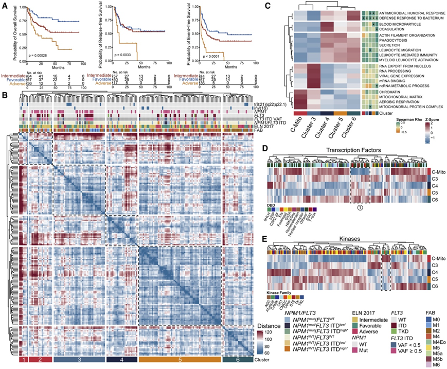 (A) 按细胞遗传学风险的 ELN 分类分层的生存概率。(B) 患者与患者距离的无监督层次聚类。 (C)基因集变异分析 (GSVA) 评分的聚类上调和下调。(D) 转录因子的聚类上调和下调。(E) 人类激酶的聚类上调和下调。