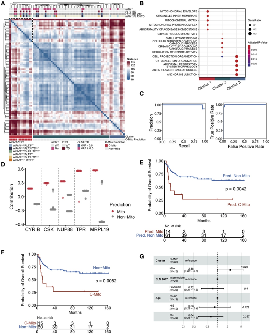 他们进一步使用验证队列来确认C-Mito患者在接受强化诱导治疗时的不良预后。对于发现队列,C-Mito患者的OS明显短于非mito患者,无论是预测的C-Mito患者(图4E),还是通过无监督聚类确定为C-Mito的患者(图4F-G)。