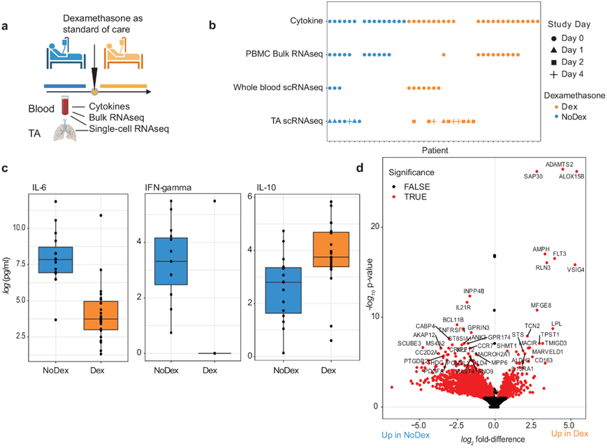 本项研究对两所医院[加州大学旧金山医学中心 (UCSFMC) 和扎克伯格旧金山总医院 (ZSFG)]患有 COVID-19 急性呼吸窘迫综合征 (ARDS) 的使用呼吸机的成年人(年龄 ≥ 18 岁)进行了一项前瞻性队列研究。患者从 2020 年 4 月纳入观察队列,在 2020 年 7 月 RECOVERY 试验公布之前,这两个机构的患者并未常规接受 COVID-19 ARDS 皮质类固醇治疗,而当时地塞米松作为重症 COVID-19 住院患者的治疗手段。研究团队间采集了患者的气管抽吸物 (TA)和外周血样本(PBMC)进行多组学分析(图 1a-b),这些样本来源于接受地塞米松 (Dex)治疗的患者和未接受地塞米松 (NoDex) 治疗的患者。