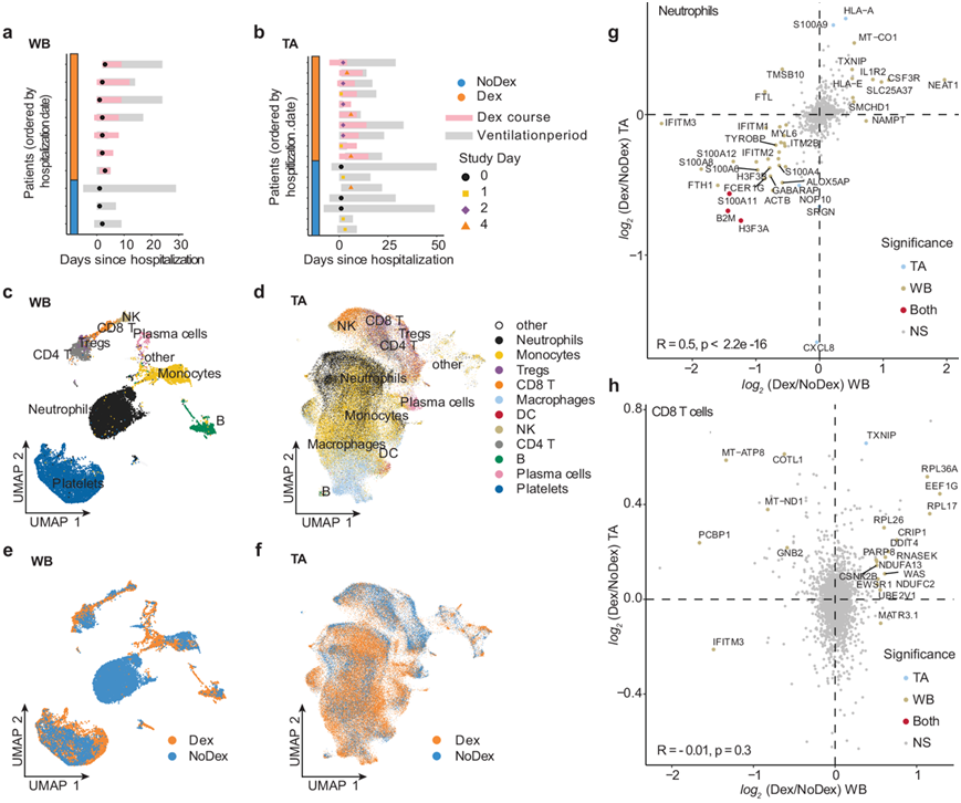 (a-b) 绘制每个患者全血 (WB)或气管抽吸物 (TA) 样本的收集情况。(c-f) UAMP可视化。(g-h) Dex 和 NoDex 基因表达的差异倍数分析。