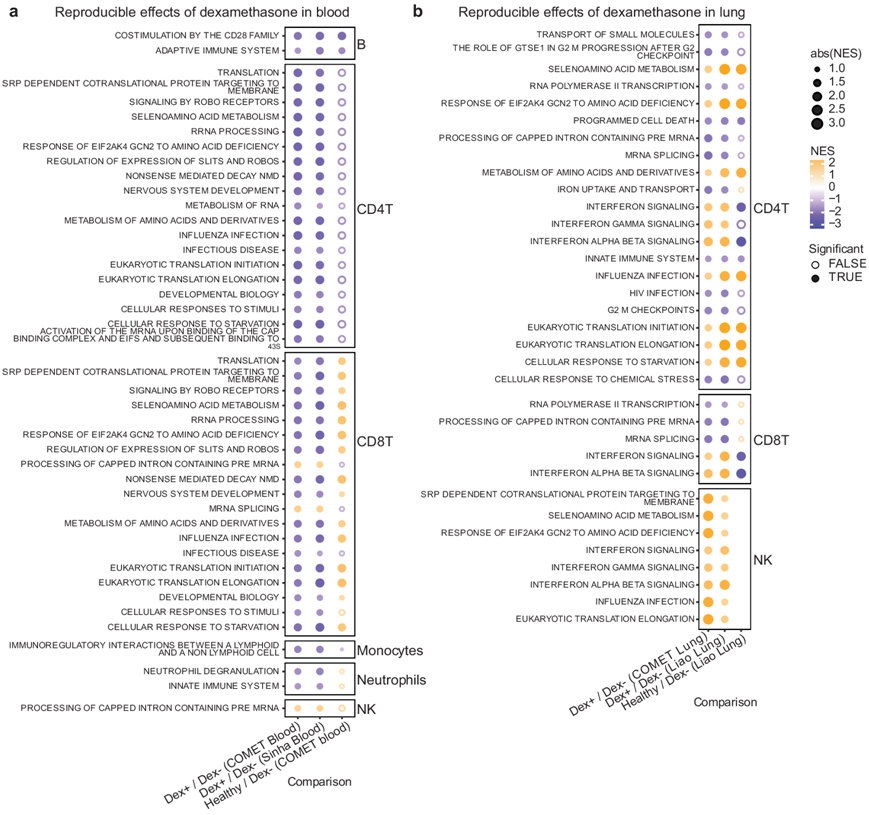 为了评估地塞米松的作用是否在数据集之间可重复,他们分析血液数据集和肺数据集(图4a-b,图S6)。在血液数据集中,他们观察到 Dex 患者的中性粒细胞中的先天免疫信号传导和脱颗粒减少,单核细胞中淋巴细胞和非淋巴细胞之间的免疫调节相互作用减少。两个血液数据集均显示 Dex 患者 B 细胞的适应性免疫反应和共刺激减少,以及 CD4 和 CD8 T 细胞中细胞反应水平以及与传染病和流感反应相关的通路降低。有趣的是,与中性粒细胞和 CD8 T 细胞的观察结果相比,B 细胞、CD4 T 细胞和单核细胞中的反应在方向上与这些途径中恢复到健康对照水平一致(图 4a)。