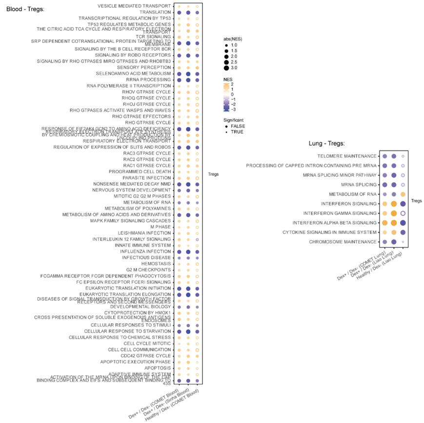 相反,在检测本项研究的肺部数据集时,观察到了可重复但通常与血液中观察到的不一致的效应,最突出的是 Dex 患者 T 细胞亚群和 NK 细胞中流感相关基因的干扰素信号和反应升高,而在血液单细胞数据集中未观察到干扰素或流感信号(图 4b)。如预期的那样,健康对照组的干扰素信号低于 COVID-19 患者。不一致的效应还包括与 CD4 T 细胞的翻译和细胞对饥饿的反应相关的通路,在 Dex 患者的肺部中似乎较高,但在血液中较低。