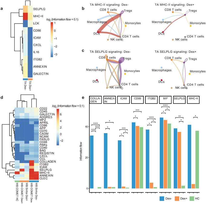 (a) 显示了 Dex和 NoDex患者的 TA 样本的 CellChat 结果的聚类热图。(b-c) MHC-II和 SELPLG 相互作用的细胞类型相互作用网络分析。(d) 血液样本的 CellChat 结果的聚类热图。(e) 在COMET 数据集中,Dex、NoDex 和健康对照者之间比较了一组显著检测到的受体-配体相互作用。