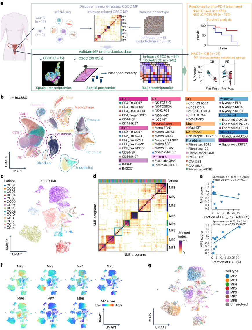 (a) 实验流程方案。 (b) 通过 scRNA-seq 分析的 163880 个细胞的 UMAP 图。 (c) 由患者着色的 20168 个肿瘤细胞的 UMAP 图。 (d) 在所有分析的 CSCC 患者的肿瘤细胞中识别出的 NMF 程序之间的成对相似性的层次聚类。 (e) 散点图显示每个患者的 MP6 特征分数与 CAF 和 CD8_Tex-GZMK 细胞分数之间的相关性。(f) 肿瘤细胞的 UMAP 图。(g) 肿瘤细胞的UMAP图,其按根据MP特征分数识别的细胞类型着色。