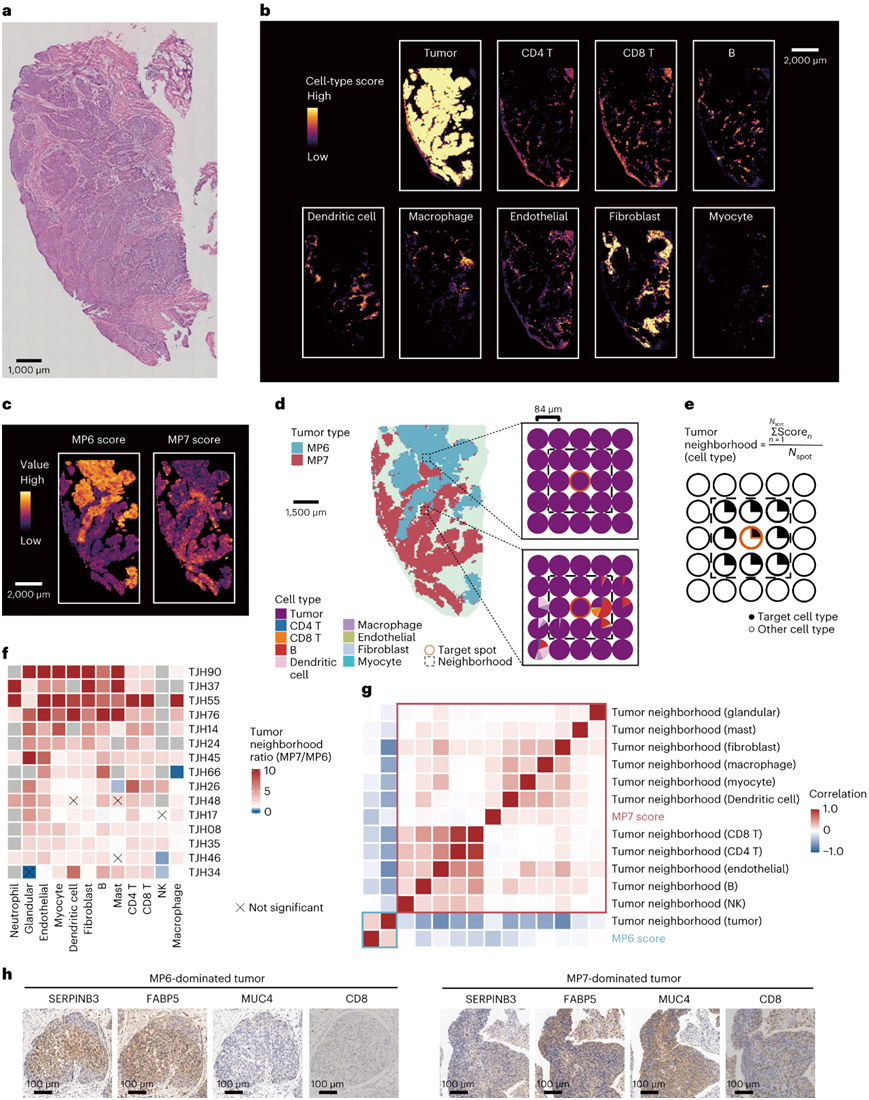 (a-b) 代表性载玻片 TJH34 中的H&E 染色和按细胞类型评分着色的斑点的空间分布。(c) 载玻片TJH34的肿瘤点中MP6和MP7特征得分的代表性空间表达。(d) MP6或MP7肿瘤点附近的TIME细胞组成。 (e) 计算肿瘤邻域评分的示意图和公式。 (f) 热图显示所有 15 张幻灯片中 MP7 和 MP6 点 (MP7/MP6) 之间各种 TIME 细胞类型的平均邻域分数的比率。 (g) 热图显示幻灯片 TJH34 内每个肿瘤点中 MP6、MP7 的特征分数和各种 TIME 细胞类型的邻域分数之间的 Pearson 相关系数。 (h) MP6和MP7为主的肿瘤区域的SERPINB3、FABP5、MUC4和CD8的IHC。