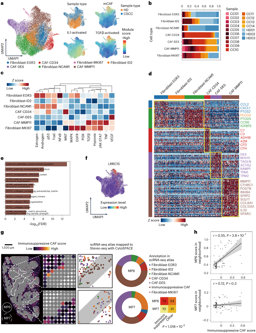 (a) 按细胞亚型、样本类型和报告的 CAF 特征的模块分数着色的成纤维细胞的 UMAP 图。 (b) 每种成纤维细胞类型的样品来源的组成。(c) scRNA-seq 中各种成纤维细胞亚型的通路活性热图。 (d) 热图显示 通过 scRNA-seq 分析的成纤维细胞类型的DEG。(e) HALLMARK 和GO分析中最富集通路的条形图。 (f) 成纤维细胞中LRRC15的表达分析。 (g) 成纤维细胞斑点中免疫抑制性 CAF 特征分数(左)和百分比(右)的空间分布。 (h) 散点图显示免疫抑制性 CAF 的基因特征评分与成纤维细胞点附近的 MP6(左)或 MP7(右)评分之间的 Pearson 相关性。