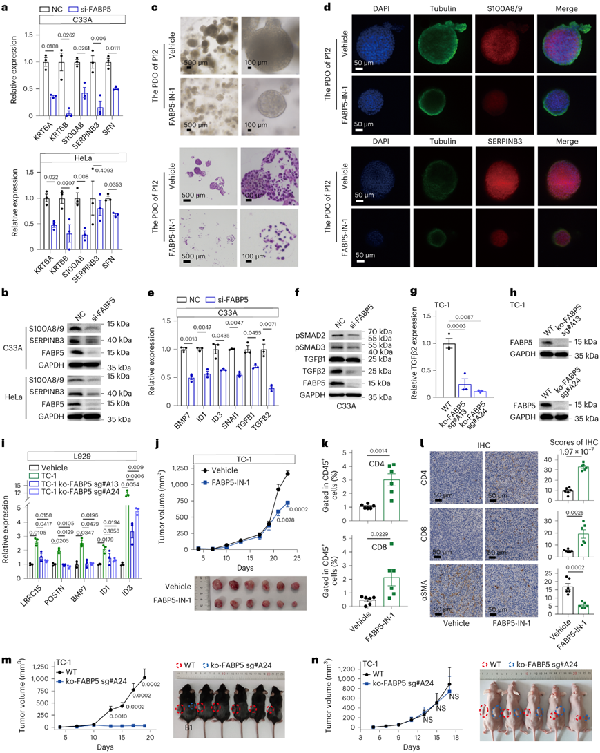 (a) 用小干扰RNA敲低FABP5(si-FABP5)48小时后,通过定量PCR(qPCR)对C33A和HeLa细胞中的MP6基因进行定量。 (b) 免疫印迹分析。(c) 形态学分析(上)和 H&E 染色(下)。 (d) 免疫荧光分析。(e-i) 免疫印迹和qPCR分析。(j) 肿瘤生长曲线(上)和肿瘤大小(下)。(k) 流式细胞分析。 (l) 免疫组化分析。(m-n) 肿瘤生长曲线和肿瘤大小分析。
