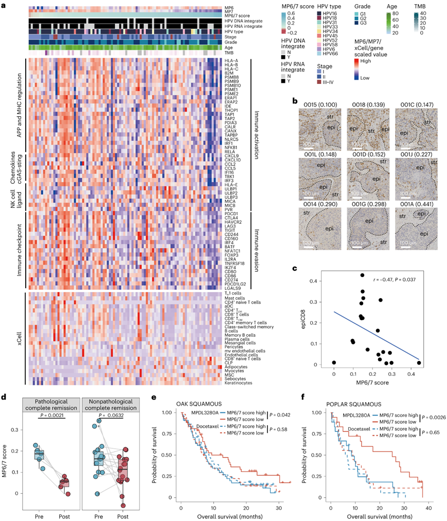 (a) 使用内部 CSCC 数据集通过 xCell 推断的免疫激活、免疫逃避相关基因和细胞组成的缩放值热图。 (b) 代表性CSCC中基质(str)和上皮(epi)区域的CD8的IHC染色。 (c) 散点图,代表从RNA-seq推断出的epiCD8和MP6/7评分之间的Spearman相关性。 (d) CSCC 中 NACT 一个周期前和后 MP6/7 分数的变化。(e-f)生存分析。