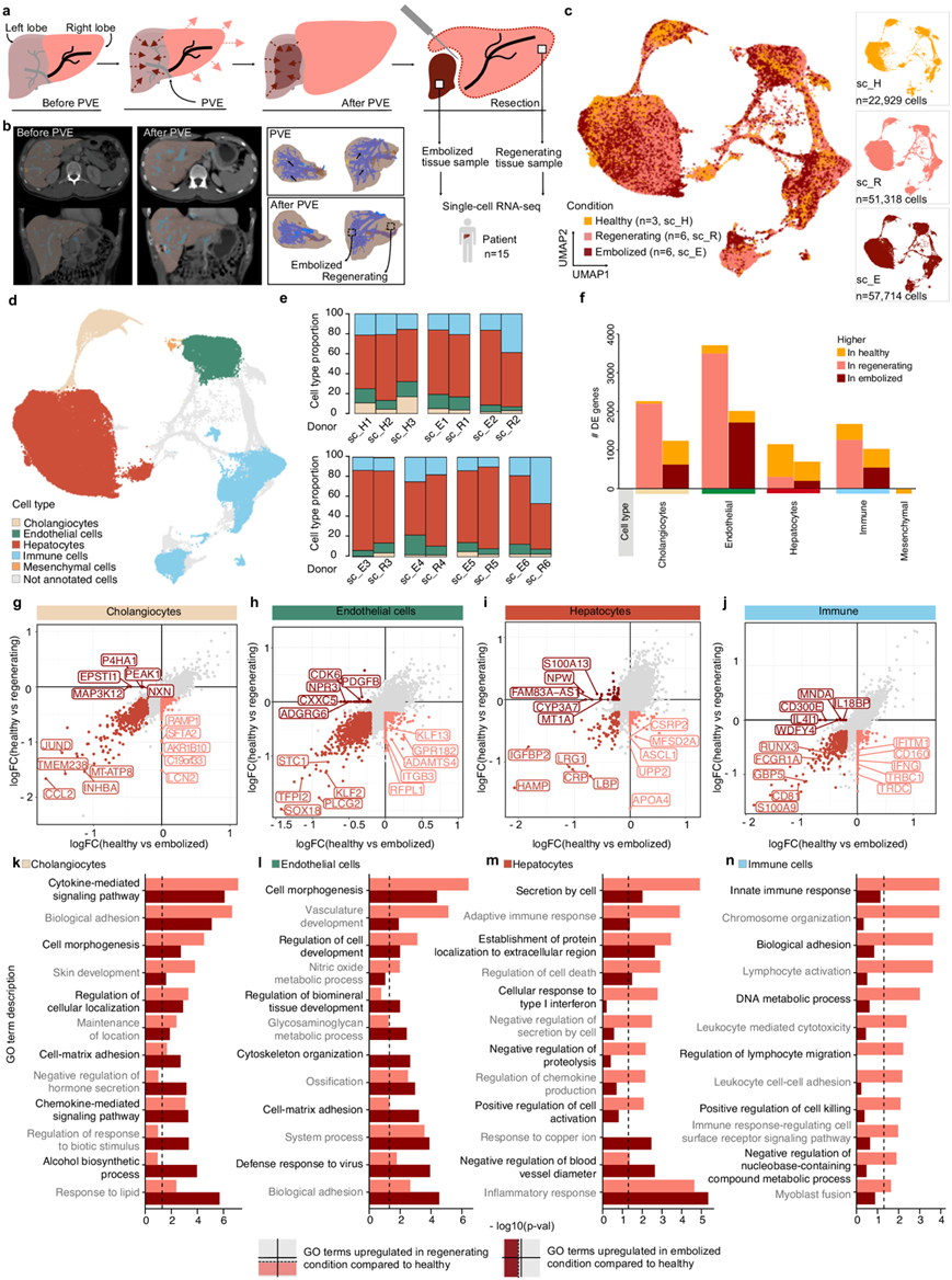 (a) 示意图显示了 scRNA-seq 实验的门静脉栓塞 (PVE) 程序和组织采样。 (b) 分别显示 PVE 前(左)和 PVE 后 (中) 肝脏的计算机断层扫描 (CT) 扫描以及 3D 组织重建(右)。(c-d)UMAP可视化。(e) 每个供体的主要细胞类型比例。(f) 每种主要细胞类型的健康与再生或栓塞样本之间差异表达基因的数量。(g-j) 与健康样本相比,PVE 后胆管细胞、内皮细胞、肝细胞和免疫细胞的基因表达变化。(k-n) GO分析。