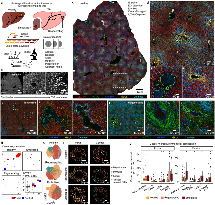 (a) 实验示意图。(b) 健康肝组织的 DAPI 染色,说明了跨长度尺度的图像分辨率。 (c-f)多重染色分析。(g) 来自肝脏 4I数据的门管和中央血管检测结果。(h) UMAP可视化。(i)代表性门管和中央血管,分割的细胞核按细胞类型着色。(j)门管和中央血管微环境中每个血管面积的细胞核比例。