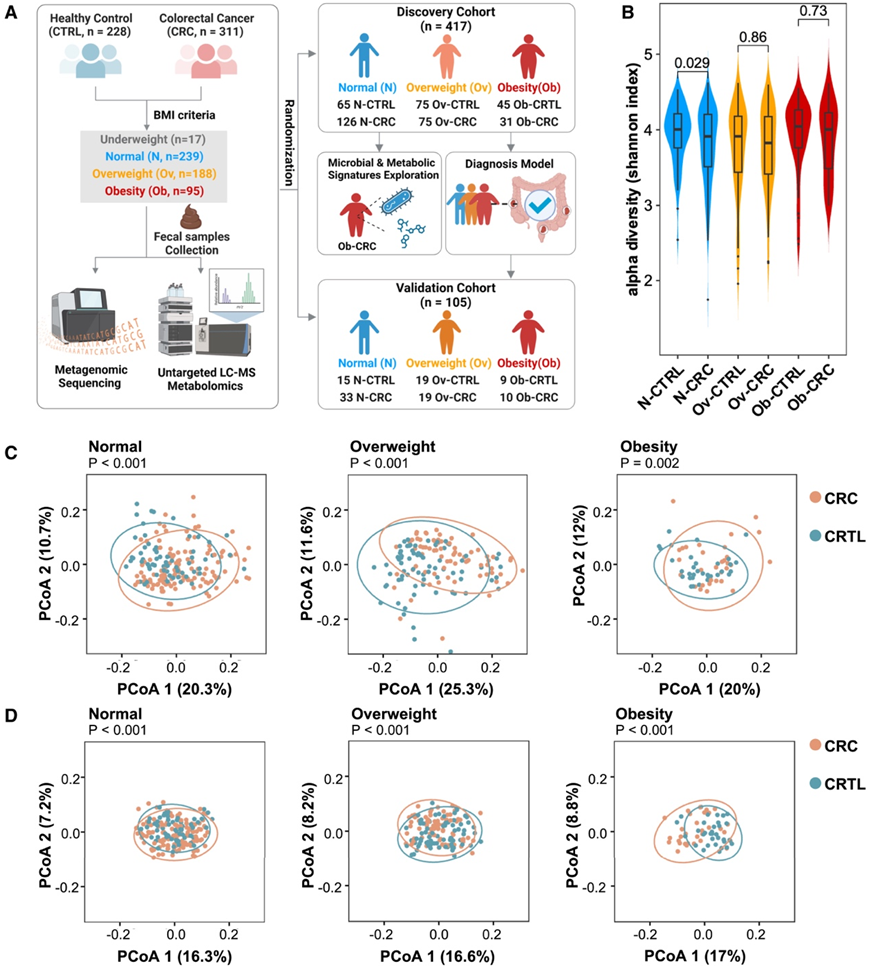(A)共收集539份粪便样本,其中包括228名健康对照(CTRL)和311名结直肠癌(CRC)患者,根据BMI分为四组:体重不足组(灰色)、正常组(蓝色)、超重组(橙色)和肥胖组(红色)。(B) 通过Shannon指数检测不同组中 CRC 患者和健康对照的α 多样性。(C-D) 物种和代谢物的主坐标分析 (PCoA)。