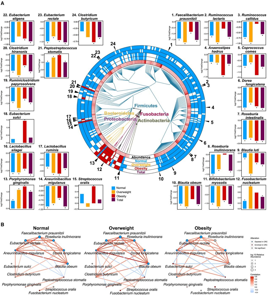 (A) 与健康对照相比,三个 BMI 组的 296 种差异富集的细菌物种显示在系统发育树中,分为厚壁菌门、拟杆菌门、变形菌门、放线菌门和梭杆菌门。(B) 通过 Spearman 相关性得出正常体重、超重和肥胖组物种之间的潜在联系。