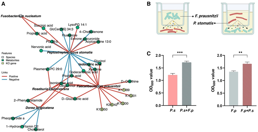 (A) 物种、KO 基因和代谢物之间的整合网络。(B) 示意图说明了F. prausnitzii和P. stomatis之间交叉喂养实验的设计。(C)与单一培养对照相比,交叉饲喂条件下F. prausnitzii和P. stomatis的细菌浓度。