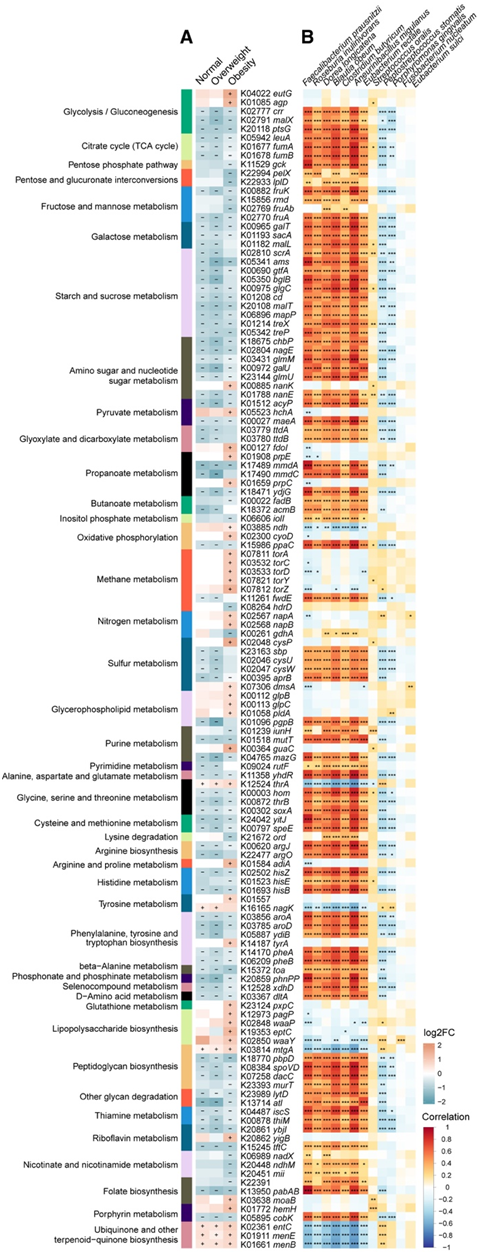 (A) 热图显示了综合Meta分析,该分析确定了在三个 BMI 组中的每个 KEGG 通路中 KO 基因表达的显著变化。(B) 差异物种和 KO 基因之间的 Spearman 相关性。