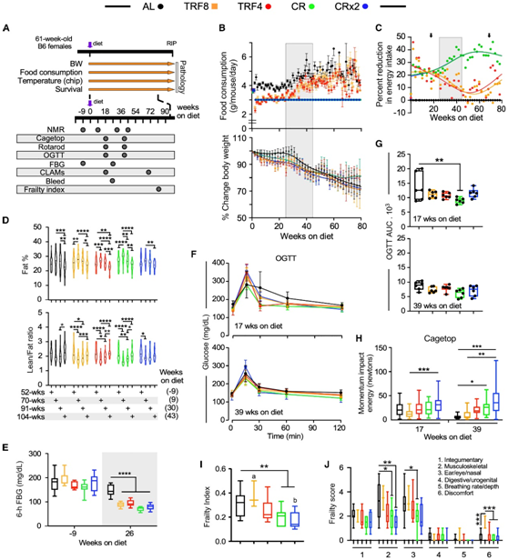 (A) 测量指定生理参数的时间表。(B) 在指定喂养方案下 80 周内的食物消耗轨迹(上)和体重变化百分比(下)。(C) 饮食转换后 80 周内的热量限制程度。(D) 通过低场核磁共振成像评估的全身脂肪量百分比(上)和瘦脂比计算(下)。(E) 基线和饮食转换后 26 周的空腹血糖 (FBG) 水平。(F) 口服葡萄糖耐量试验 (OGTT) 期间血糖清除率的轨迹。(G) OGTT 实验的曲线下面积 (AUC)。(H) 来自倒置笼顶实验的冲击能动量。(I-J)记录总体衰弱指数评分和特定领域衰弱评分。