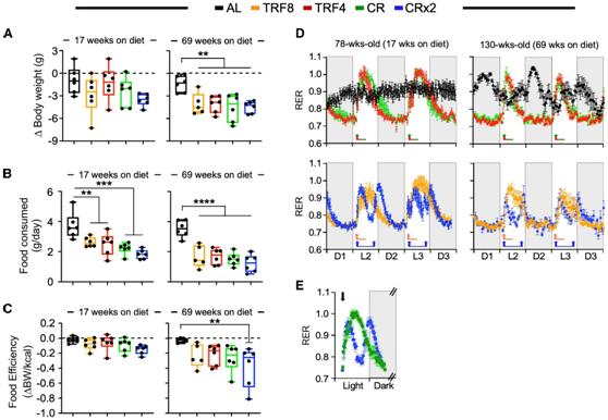 为了确定不同喂养方案对全身代谢功能的可能影响,他们捕获了60小时内每小时的能量参数轨迹(暗期[D];亮期[L])。在 TRF8、TRF4、CR 和 CRx2 组小鼠与 AL 喂养对照组小鼠中观察到RER 的独特昼夜模式(定义为 VCO2 /VO2比率) (图 2 D)。经过 17 周的干预后,在 AL 组的雌性小鼠中观察到暗周期和光周期之间的 RER 波动最小,而将饮食改为 TRF8、TRF4 和 CR 会导致在上午 8:30 喂养时出现较大的 RER 波动(图2D)。由于CRx2小鼠在上午8:30和下午4:30进食了2次,他们注意到与CR小鼠相比,RER振幅更小,碳水化合物燃料利用的持续时间更短(图2E)。在69周的饮食转换后,他们观察到类似的轨迹,尽管AL和TRF小鼠随着年龄的增长摄入的食物比CR和CRx2小鼠更多,但RER波幅更小,持续时间更短(图2D)。