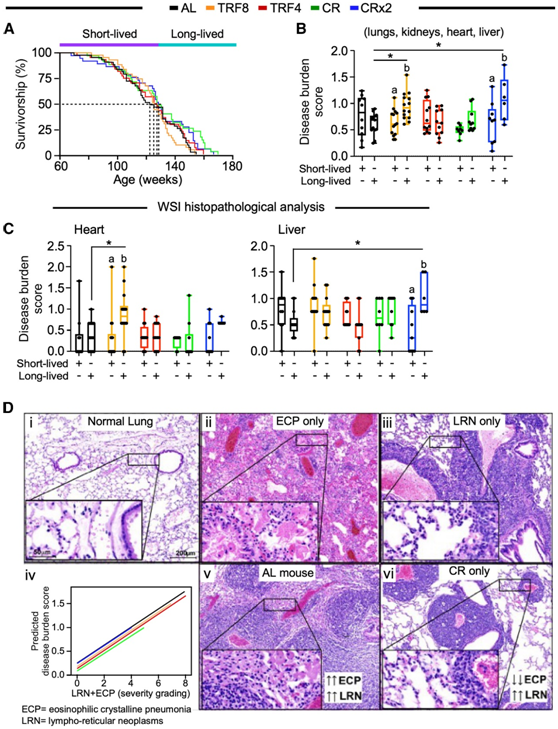 在所分析的四个器官(肺、肾、心脏和肝脏)中,每种病理的类型、患病率或严重程度均存在非统计学上的显著差异。在长寿TRF8和CRx2小鼠中,综合疾病负担评分(来自4个器官的综合平均评分)(图3B)和单个器官(包括心脏和肝脏)的评分分别显著高于AL对照(图3C)。在肺部,无论选择哪种喂养方式,淋巴网状内皮细胞瘤子(LRN) 和嗜酸性结晶性肺炎 (ECP) 是该组织中最普遍的病理特征。与 AL 组小鼠相比,CR 组小鼠表现出与 LRN 和总体肺损伤相关的最不严重的 ECP 形式(图3D)。这些结果表明,即使从中年开始,CR 干预也可以减少恶性肿瘤的进展和肺部炎症性疾病的严重程度。