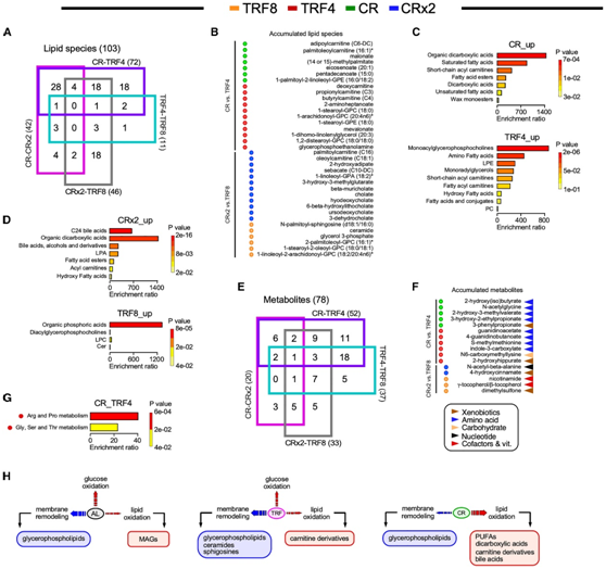 (A) 具有 HMDB 标识符的 103 种脂质种类的四向维恩图。(B)血清脂质种类的显著积累。(C-D)积累的脂质种类的富集分析。(E) 78 种血清代谢物与 HMDB 标识符的 4 向维恩图。(F)血清代谢物显著积累。(G) CR 与 TRF4 中耗尽的代谢物的富集分析。(H) 图表大致描绘了喂食 AL、TRF 和 CR 的小鼠血清中不同的脂质代谢特征。