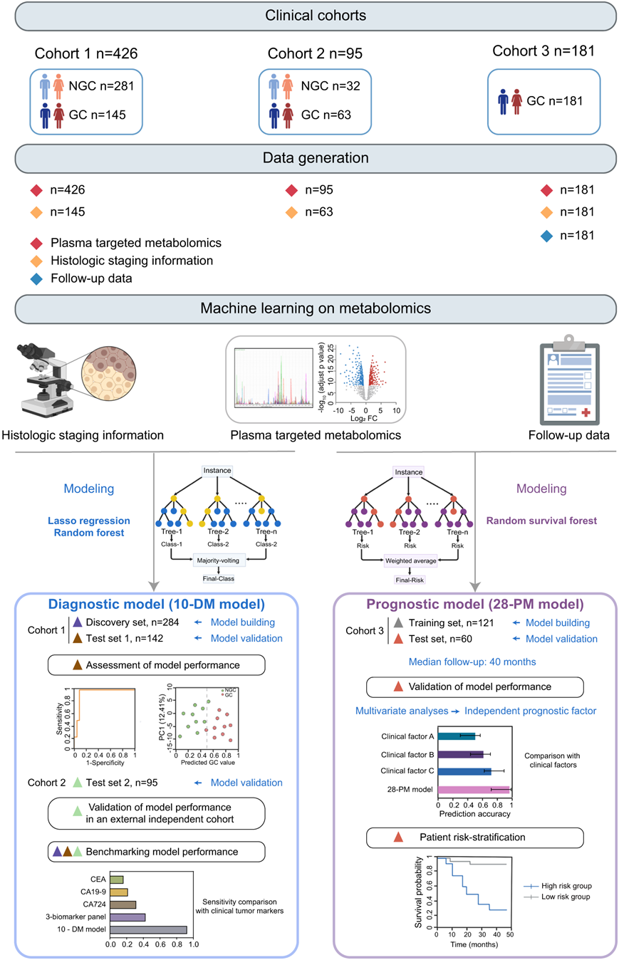 本项研究对来自多中心参与者的 702 份血浆样本进行了有针对性的代谢组学分析,以阐明 GC 代谢重编程,机器学习分析揭示了 10 种代谢物 GC 诊断模型,该模型在外部测试集中得到验证,灵敏度为 0.905,优于利用癌症蛋白标记物的传统方法(灵敏度 < 0.40)。此外,本项研究的机器学习衍生的预后模型利用临床参数表现出优于传统模型的性能,并有效地将患者分为不同的风险组以指导精准干预。总的来说,这项研究结果揭示了GC的代谢状况,并确定了两个不同的生物标志物组,分别能够进行早期检测和预后预测,从而促进GC的精准医疗。