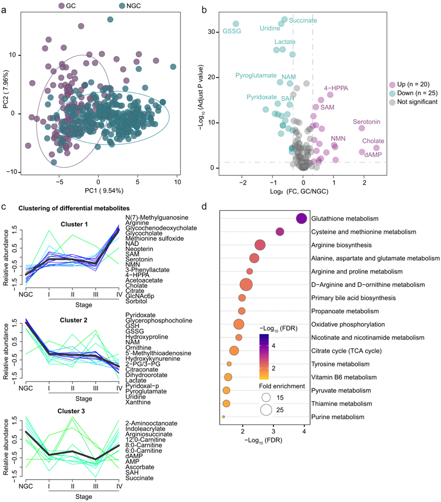 (a) 队列1 血浆靶向代谢组学数据的主成分分析(PCA)。(b) 队列1血浆代谢组学中检测到的代谢物的火山图。(c) 根据代谢变化的相似性,使用差异代谢物对 GC 进展期间的代谢轨迹进行 Mfuzz 聚类。(d) KEGG代谢途径富集了 GC 患者和 NGC 对照之间显著差异的代谢物。