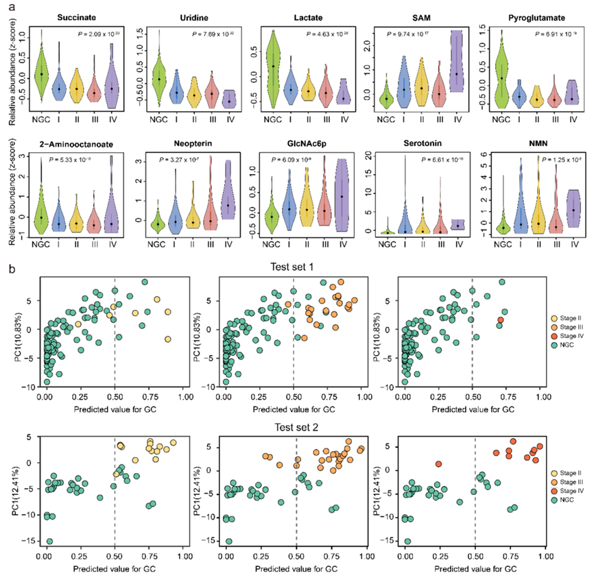 (a) 在队列1中使用相对丰度的建模代谢物的小提琴图。(b) 在测试集1和2中,10-DM模型区分II/III/IV期GC和NGC的预测性能。