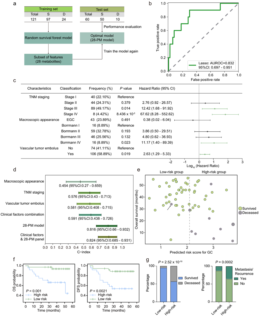 由于精确的预后可以实现精确的干预并有利于临床上患者的治疗结果,因此他们还尝试开发一种机器学习衍生的预后模型。为此,他们收集了 181 名 GC 患者(队列3)血浆中的代谢组学概况,并在中位随访期 40 个月的情况下收集了他们的临床信息。然后利用随机生存森林方法建立了28代谢物预后模型(28-PM模型)。具体来说,训练集患者最初使用 147 种代谢物参与模型构建。然后,为了避免模型过度拟合,选择 28 种代谢物作为重新训练最佳模型(28-PM 模型)的关键特征,其一致性指数(c 指数)为 0.90(图 4a)。随后,28-PM模型在测试集上进行评估,显示出有效的预测能力,AUROC为0.832 (95% CI: 0.697-0.951,敏感性:0.900,特异性:0.700),c指数为0.83(图4b)。