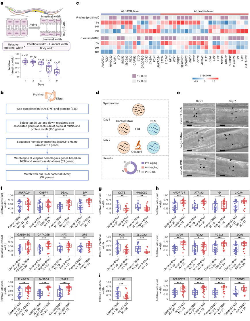 (a) 肠道萎缩和管腔扩大是线虫肠道衰老的特征。(b) 筛选年龄相关基因进行功能研究的流程图。(c) 热图显示近端和远端结肠中 37 个选定基因的表达。(d) 验证线虫中年龄相关基因的实验流程图。(e) 用RNAi敲低相应基因后的代表性结果。(f-i) 线图描绘了使用 RNAi 敲低目标基因后线虫的相对肠道宽度。