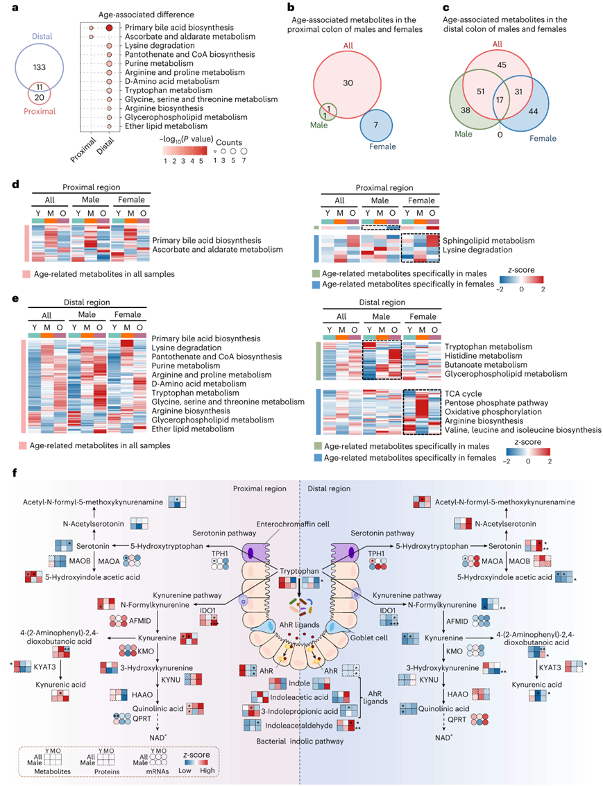 (a) 维恩图显示近端和远端结肠中重叠的年龄相关代谢物。 (b-c) 维恩图显示了所有雄性和雌性样本中近端和远端结肠中与年龄相关的代谢物数量。 (d-e) 热图显示每组近端和远端结肠中年龄相关代谢物的表达水平。 (f) 近端和远端结肠中色氨酸代谢途径中的酶和代谢物的水平。