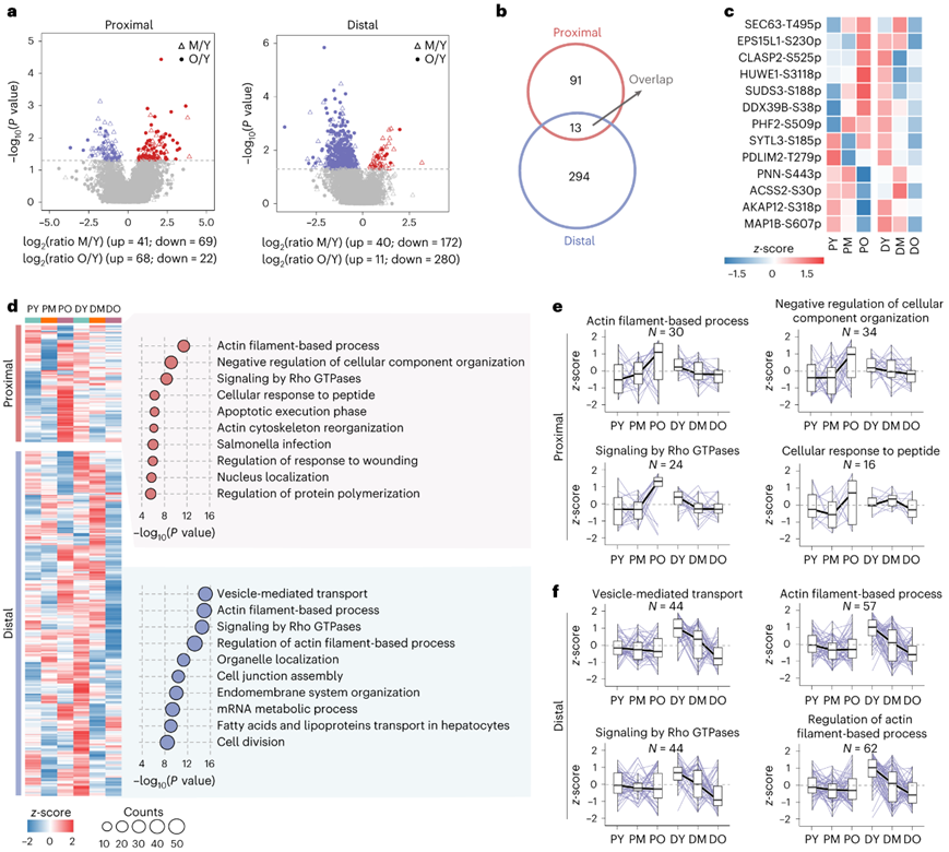 (a) 火山图显示近端和远端结肠中中年和年轻个体之间以及老年和年轻个体之间差异表达的磷酸位点。(b) 维恩图显示近端和远端结肠之间重叠的年龄相关磷酸位点。 (c) 热图显示近端和远端结肠中 13 种常见的与年龄相关的磷酸位点的水平。(d)热图显示近端和远端结肠中与年龄相关的磷酸位点的水平。(e-f) 箱线图显示近端和远端结肠中代表性富集途径中磷酸位点的水平。