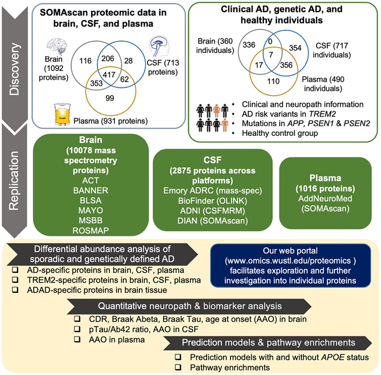 阿尔茨海默病 (AD) 是导致痴呆症的最常见原因,会降低患者和护理人员的生活质量。AD 的特点是大脑中含有 β 淀粉样蛋白 (Aβ) 的斑块和 tau 神经原纤维缠结,导致神经元丢失、神经炎症和记忆力下降。AD 的蛋白质组学研究有助于确定 AD 途径,但通常侧重于单一组织和散发的 AD 病例。对遗传定义的 AD 亚型(包括TREM2和 ADAD 病例中具有 AD 风险变异的个体)进行蛋白质组学分析,对于充分了解这种异质性疾病的生物学以及识别 AD 亚型特异性分子标记和治疗靶点非常重要。