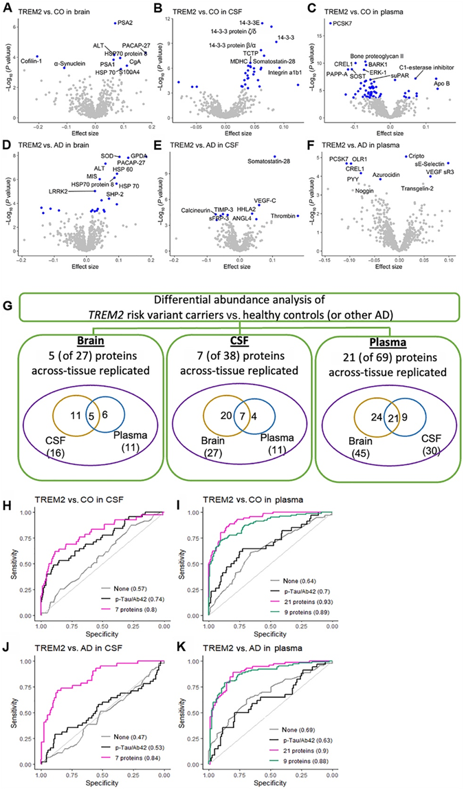 (A-C) 火山图显示了TREM2变异携带者和健康对照 (CO) 之间差异丰度。(D-F) 火山图显示脑部和 CSF 中针对差异丰度TREM2变异携带者和不带任何TREM2变异的散发性 AD 病例测试的所有蛋白质的表达。尽管此处标记了排名前 10 的蛋白质。(G) 总结显示三种组织中已识别的跨组织复制蛋白质。(H-K) 组织特异性 ROC 曲线显示基于跨组织复制的蛋白质的预测模型的性能。