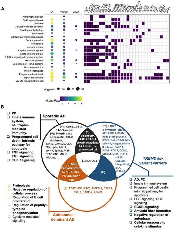 (A)(左)点图显示了散发性 AD 患者、TREM2携带者和 ADAD 患者共有的几种途径。点的大小对应于已识别基因的数量。点的颜色对应于 FDR 校正的显著性。(右)平铺图显示属于特定途径的差异表达基因。(B) 维恩图显示了三组 AD 中已识别蛋白质的重叠:散发性 AD 的 56 个外部复制蛋白质、 TREM2的 33 个跨组织复制蛋白质以及 ADAD 的 DIAN CSF 数据中复制的 14 个蛋白质。