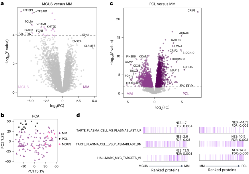 (a) 整体蛋白质水平分析。(b) MM、MGUS 和 PCL 样本的整体蛋白质组数据的 PCA。(c) MM 样本与 PCL 中的整体蛋白质水平进行比较。(d) 该图显示按等级排序的蛋白质。