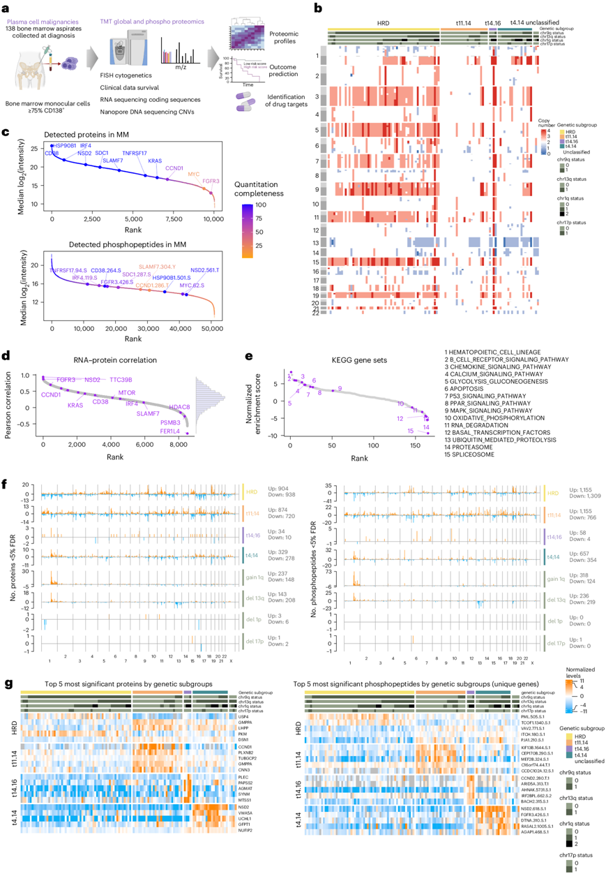 (a) 蛋白质组学研究概述。(b) CNV 热图,按主要遗传亚组排序。(c) 通过基于 TMT 的质谱法检测到的蛋白质和磷酸肽按中位强度排序。(d) mRNA-蛋白质水平 Pearson 相关性。(e) KEGG 通路分析。(f) 每个细胞遗传亚群中差异调节的蛋白质(左)和磷酸肽(右)。(g) 热图显示 MM 样本中每个遗传亚群中五种最显著的蛋白质(左)和磷酸肽(右)。