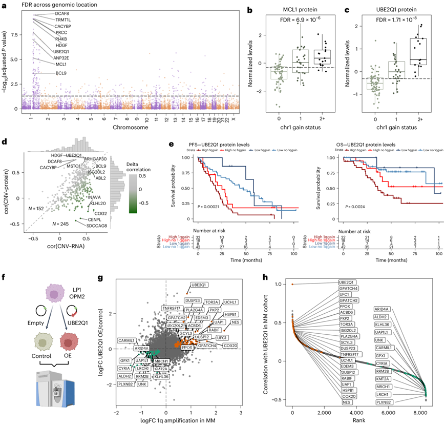 (a) 将具有 1q 拷贝数增益的 MM 样本的整体蛋白质水平与所有其他样本 进行了比较。(b) 按 1q 增益状态分组的 MM 患者的 MCL1 蛋白水平。(c) 按 1q 增益状态分组的 MM 患者的 UBE2Q1 蛋白水平。(d) Pearson相关系数分析。(e)生存分析。(f) UBE2Q1在LP1和OPM2细胞系中过表达。(g) LP1细胞和1q增益的MM患者中调节的蛋白与骨髓瘤队列中UBE2Q1蛋白水平相关。(h) 蛋白质水平的相关性分析。